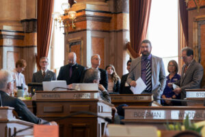 The Iowa Legislature formally recognized the University of Northern Iowa sesquicentennial milestone in Des Moines Wednesday, with resolutions read in both chambers of the Capitol. House Resolution no. 112 and Senate Resolution no. 111 honors the university’s 150 years of service to the state of Iowa. The legislative recognition coincided with UNI Day at the Capitol, where each year students, faculty and staff come to Des Moines and showcase UNI’s impact across Iowa’s communities and economy.